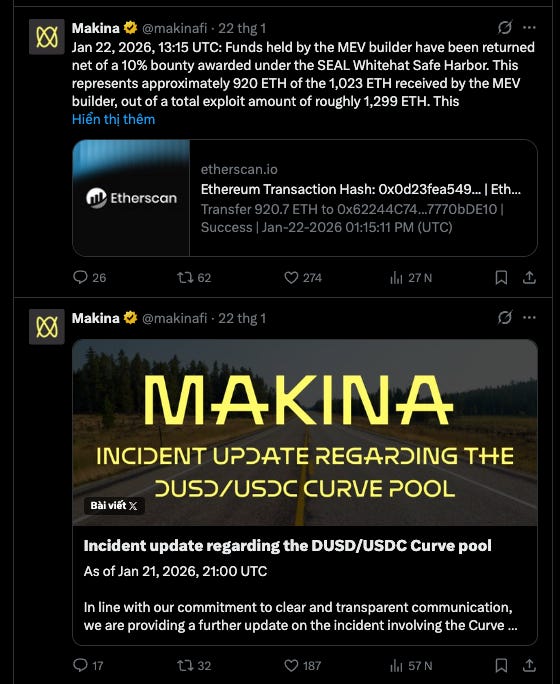 On January 20, 2026, Makina Finance fell victim to a sophisticated oracle manipulation attack, resulting in a loss of approximately $4.13 million. The attacker exploited the protocol’s reliance on spot pricing from a Curve Finance pool to manipulate the value of the MachineShareOracle. By heavily distorting the liquidity in the underlying DUSD/USDC pool via a flash loan, the attacker was able to artificially inflate the share price, deposit assets at this manipulated value, and subsequently exit with a significant profit.