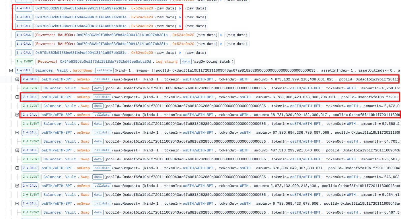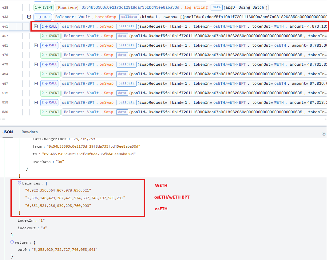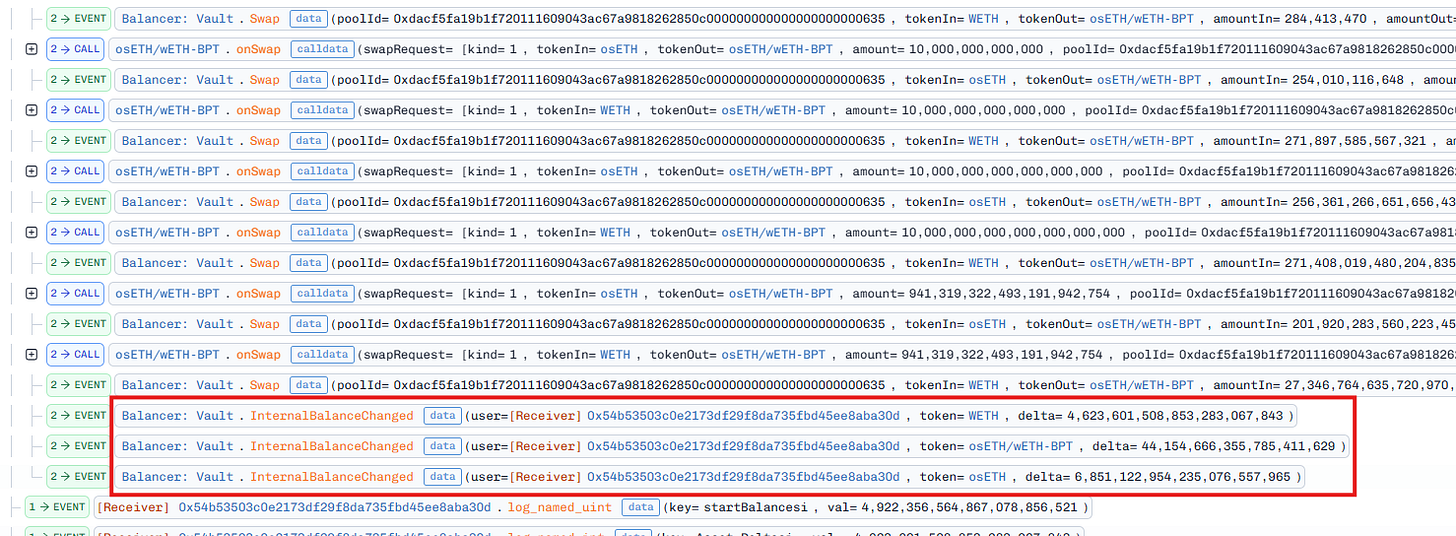 At the beginning of the batchSwap call, we can see a series of swaps from the BPT token to the WETH and osETH tokens. This means the attacker was trying to drain the balance of both underlying tokens of the pool. This is the result at the end of these swaps:
