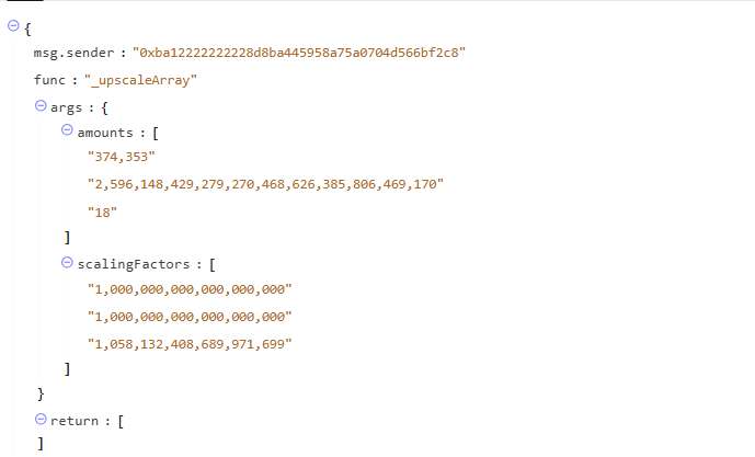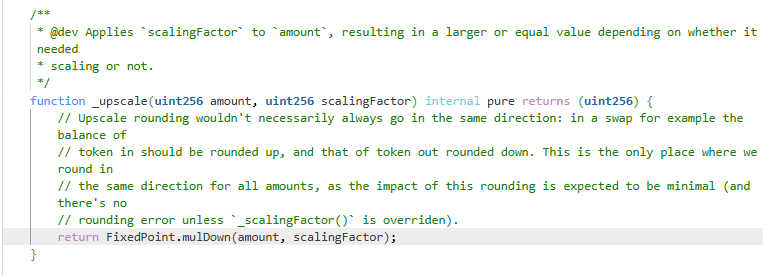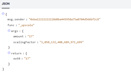 However, the swap amount is unchanged after the _upscale call. This might be the reason why the attacker chose the number of 17 for the swap amount. We can guess that there is some rounding error here, in the _upscale implementation.