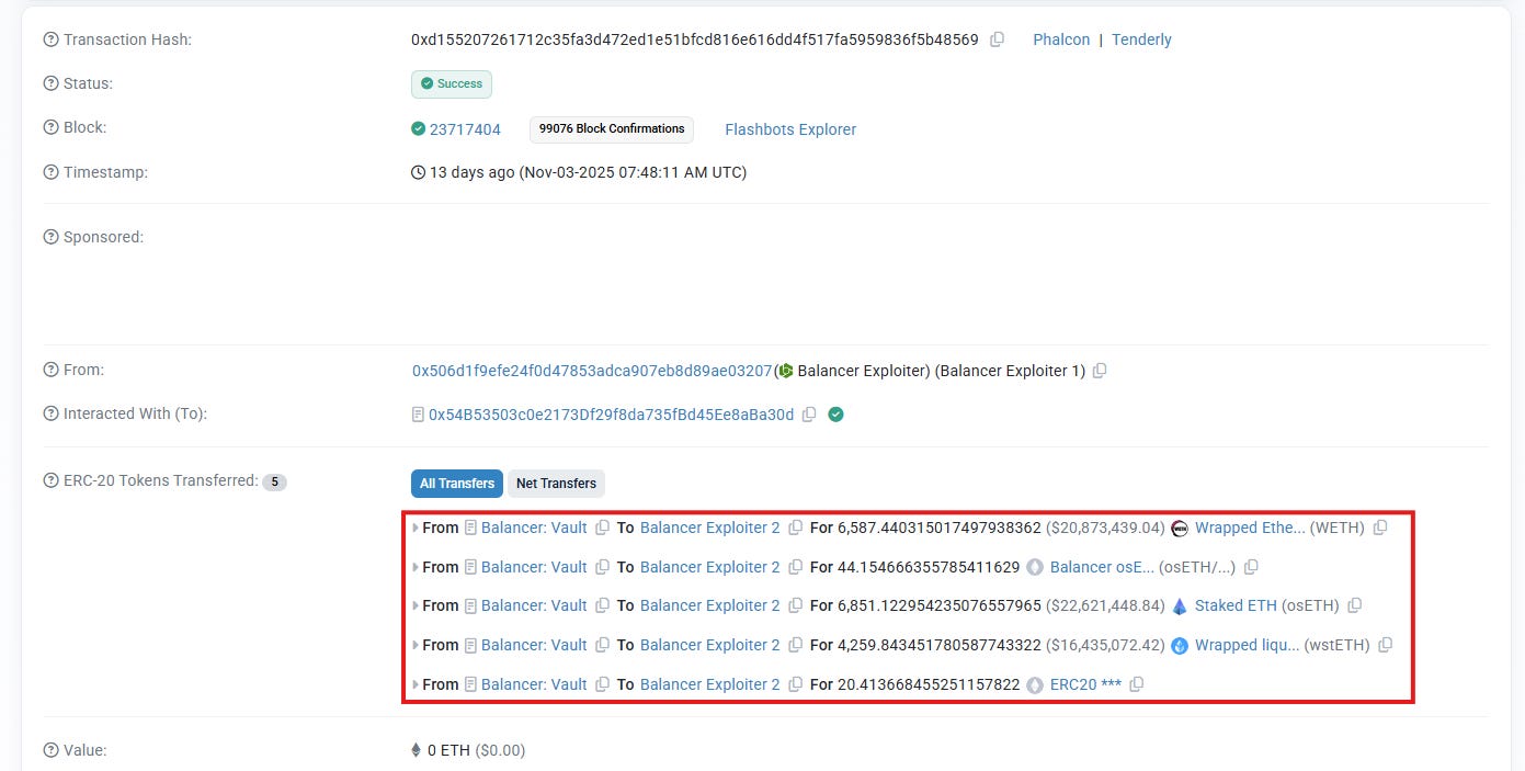 Look at the transaction where the attacker withdrew a huge amount of tokens such as WETH, osETH, wstETH, etc. out of the pool. However, this transaction is not the actual attack transaction.