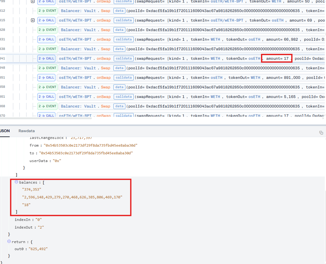 So, we can clearly see that the attacker was trying to precisely adjust the balance of the osETH tokens, setting it to 18 and then attempting to swap out 17 wei of osETH. Why was the number 17 chosen? To understand this, we need to look at the implementation of the onSwap function.