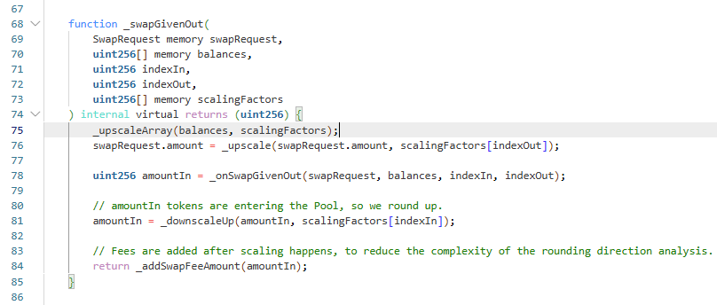 uint256 amountIn = _onSwapGivenOut(swapRequest, balances, indexIn, indexOut);