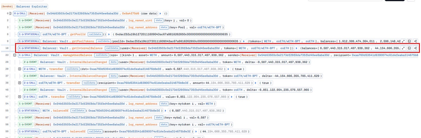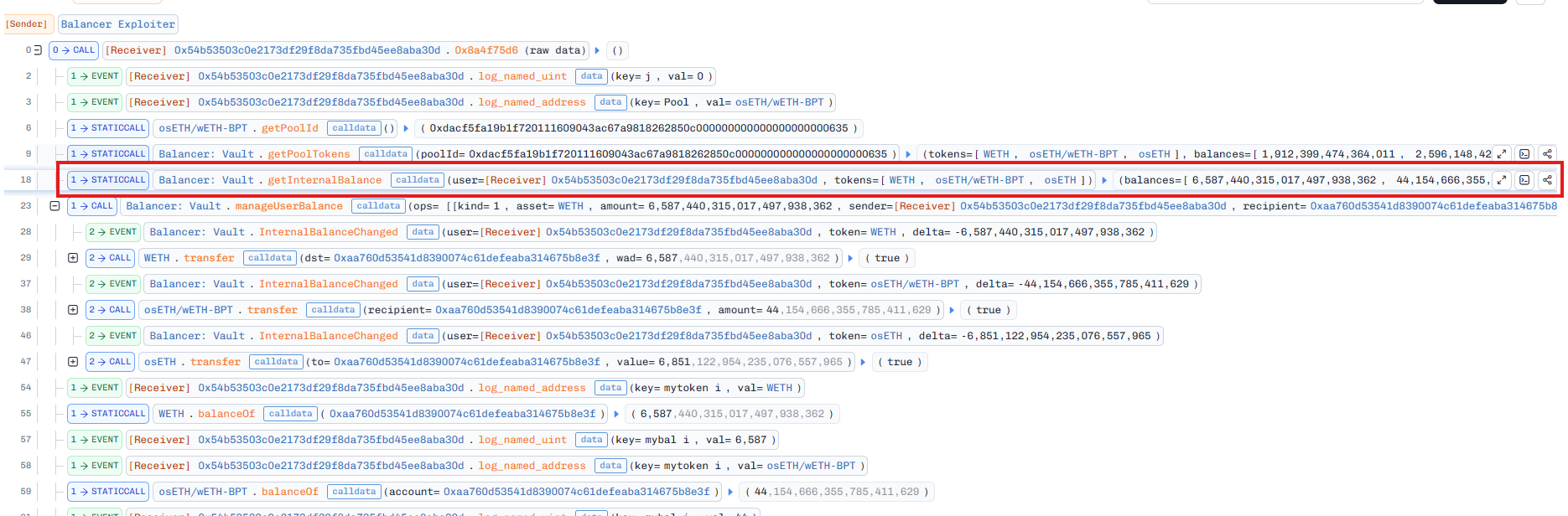 Take a deeper look, we can see that these tokens have been recorded as internal balances of the attacker in the vault contract. So, the real attack transaction must have been done prior to this transaction. The attack had been split into multiple transactions to avoid MEV bots front-running the attack.