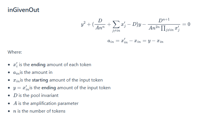 Solving this equation using the Newton-Raphson method, we can calculate the amount of input token needed to swap out a given amount of output token, amplification parameter (A), balances of the tokens in the pool and the invariant (D) of the pool.