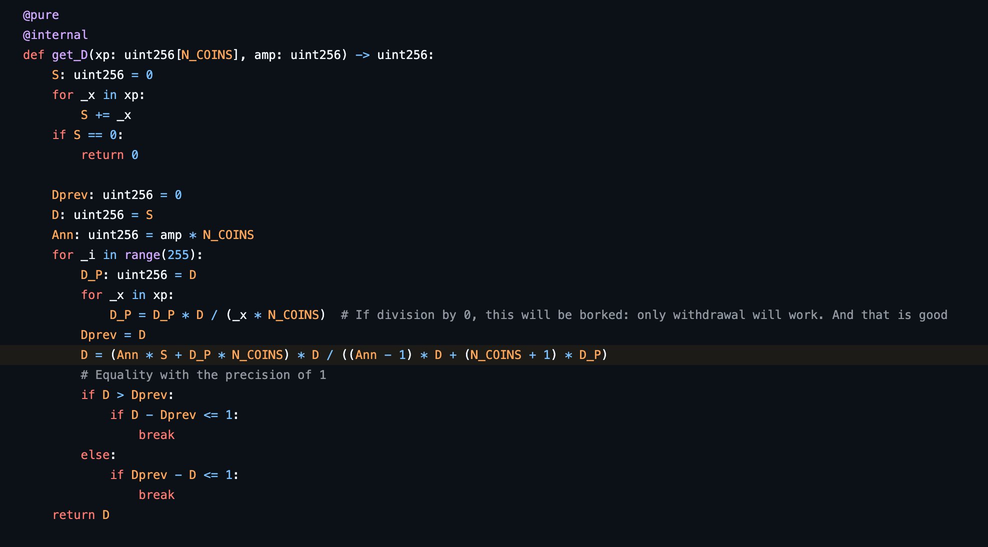 In the StableSwap source code, it calculates D by calculating D_next: