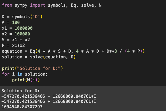 For example, we have 100,000 USDC and 1,000,000 USDT in the pool. Using (3) or (4), we can calculate D approximately 1,094,540.84. This is a simple Python script for D with (5) (because it’s the example for (4)):