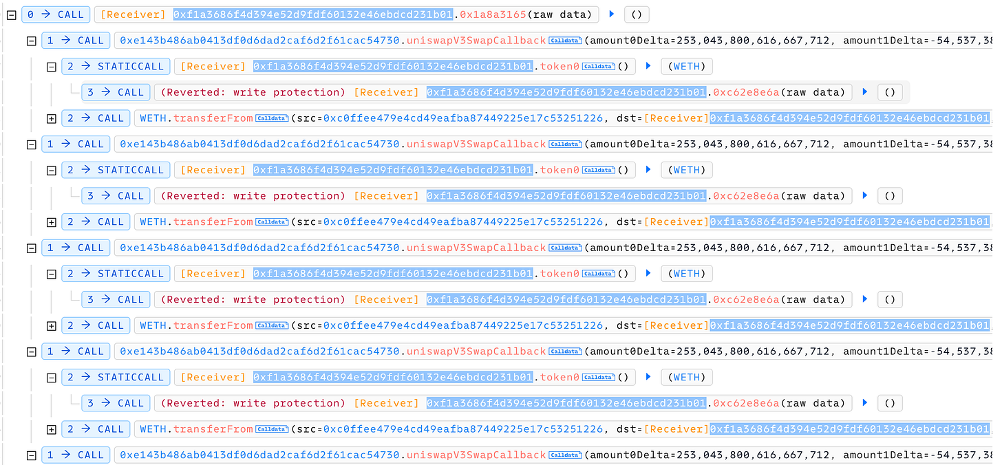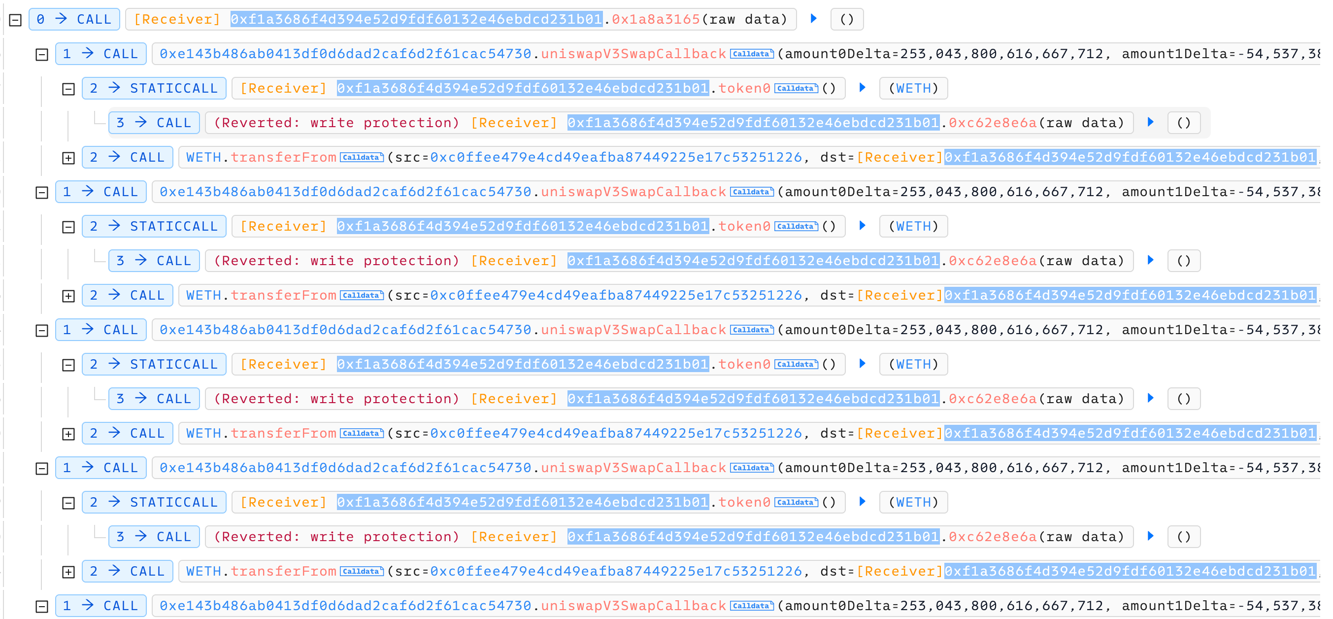 The attacker exploited this vulnerability to launch a sophisticated attack against the protocol. They deployed a malicious smart contract specifically designed to repeatedly call the uniswapV3SwapCallback function in a loop, manipulating the callback mechanism to their advantage. Through this exploit, the attacker was able to drain funds from the protocol, ultimately walking away with approximately $218,000 worth of WETH (Wrapped Ethereum). This incident highlights the critical importance of implementing proper access controls in callback functions to prevent unauthorized execution.