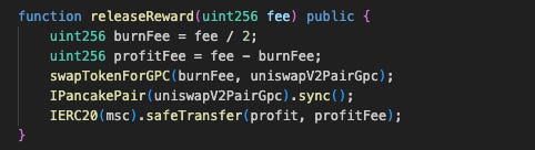 The MSCST Smart Contract contains a releaseReward function that accepts an amount parameter. The function swaps half of this amount from MSC tokens to GPC tokens, then transfers the swapped GPC directly to the GPC/WBNB pool. However, the function lacks access control, allowing anyone to call it. The attacker exploited this vulnerability using flash loan techniques to manipulate the GPC/WBNB pool price and extract profit