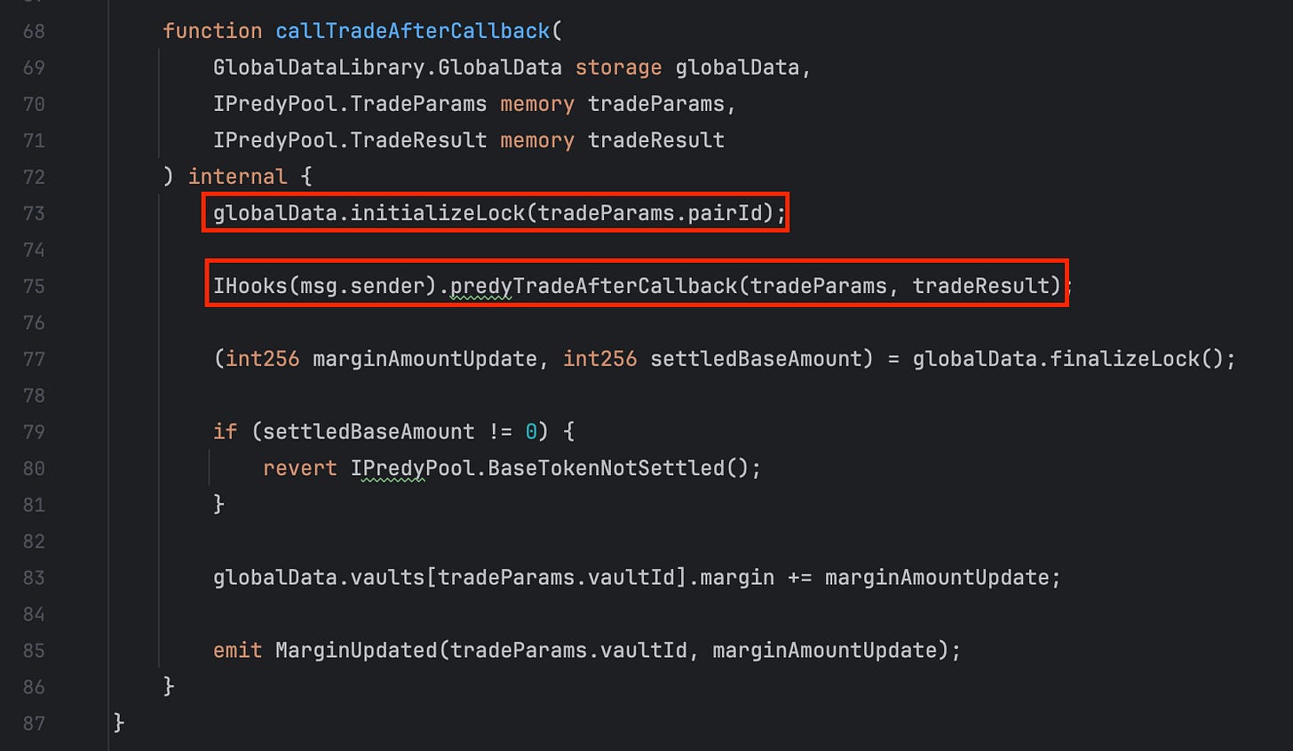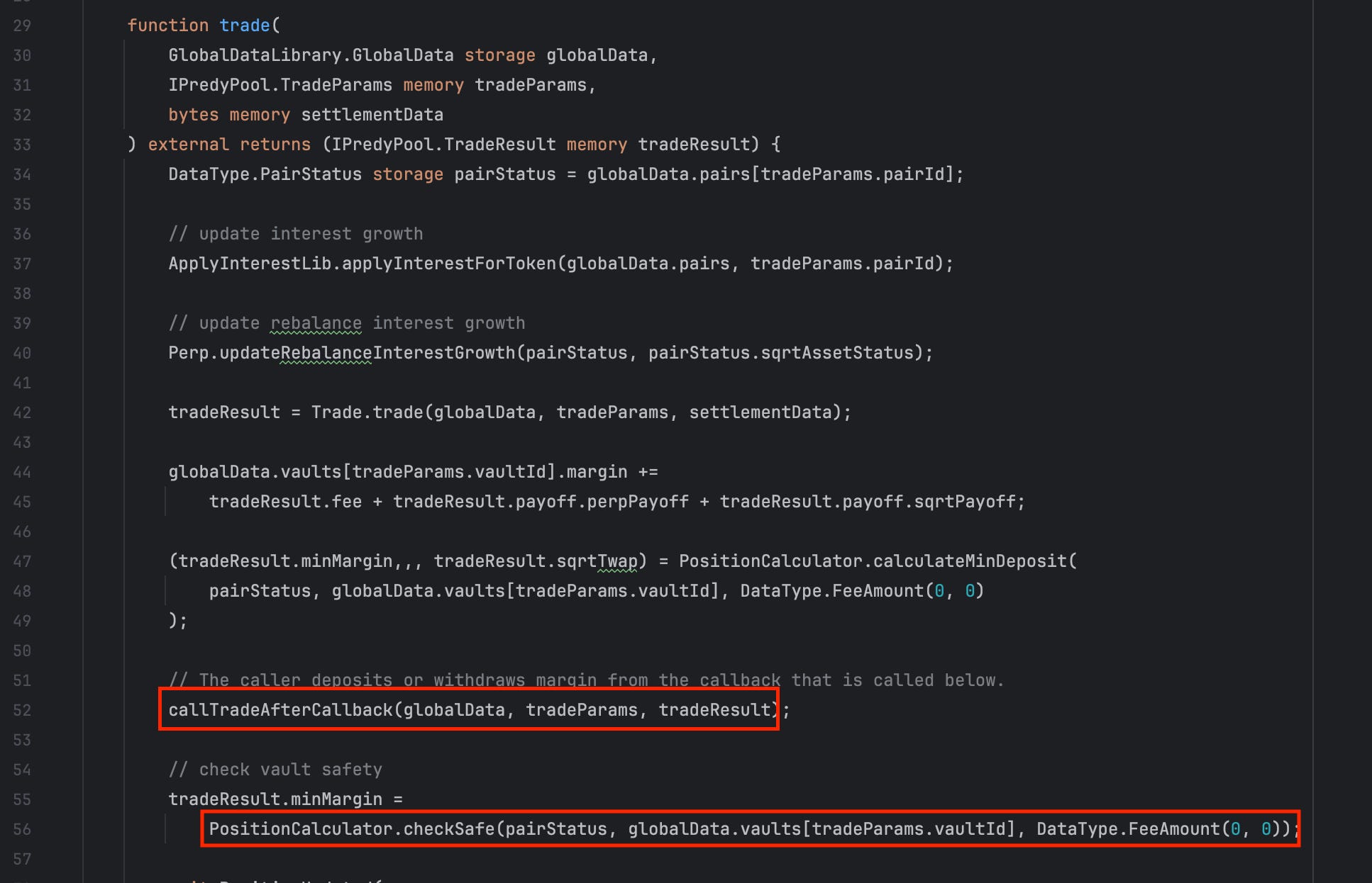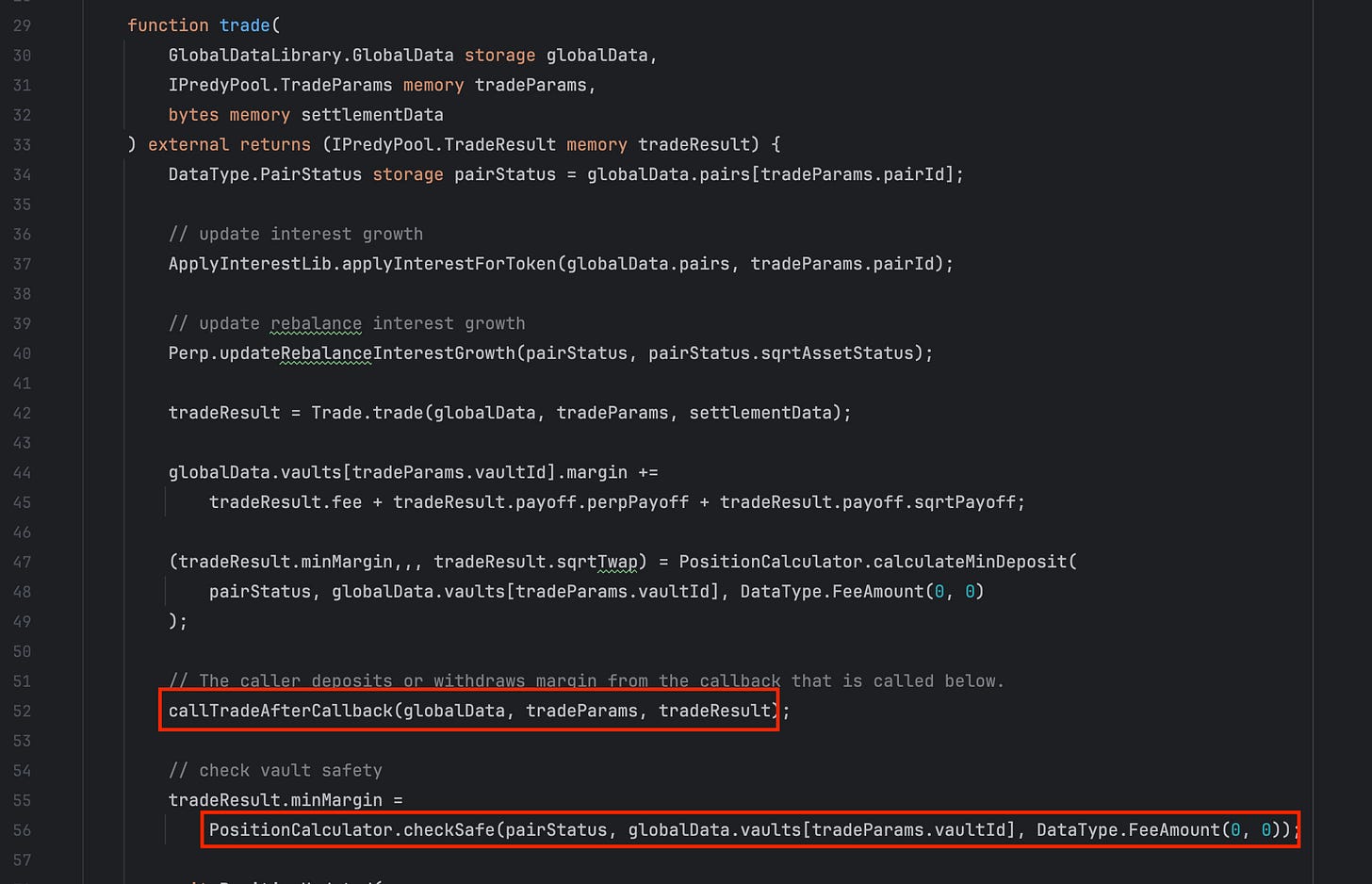 Examining the source code of the trade function, we can see that it will make a call to callTradeAfterCallback and subsequently trigger the predyTradeAfterCallback hook to the attacker's contract. The code responsible for protecting the contract’s assets from being drained after the trade call is PositionCalculator.checkSafe(), located at the bottom of the trade function.