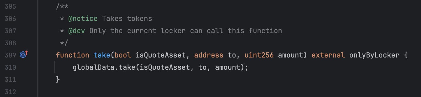 Inside the callback hook, the caller can freely call the take function, which is protected by the onlyByLocker modifier, to borrow tokens from the pool.