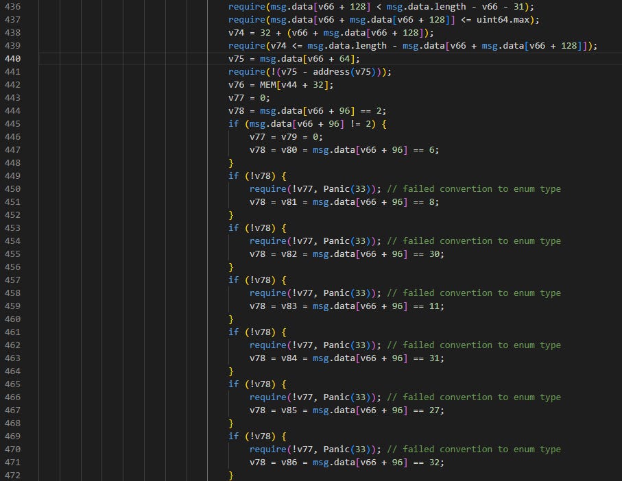 Based on the decompiled bytecode, the vulnerable function 0x87395540() handles the core swap routing logic. For each swap step, the contract determines the DEX type and executes the appropriate swap. The contract supports dozens of DEX types identified by numeric codes in msg.data: