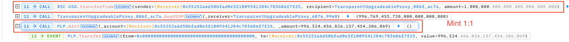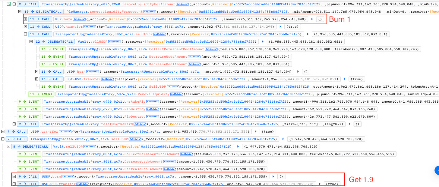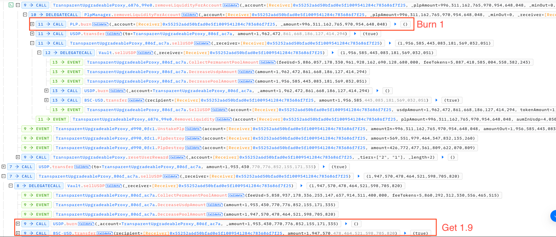 However, the problem arose when the attacker attempted to remove the same amount of $PLP, as they were able to exchange it for 1.9 times more $USDP than the original amount added. This discrepancy allowed the attacker to exploit the system, gaining an unfair advantage and benefiting from the flawed liquidity mechanism. The silver lining is, the platform had recovered 80% of the fund through negotiation with the white hat.