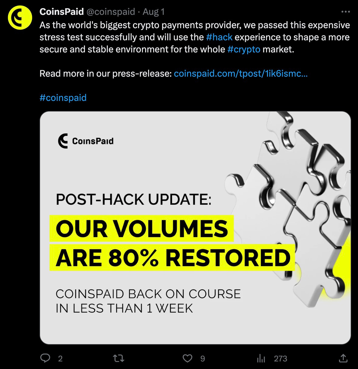 CoinsPaid has since restored 80% of its volume with no loss to its customers.