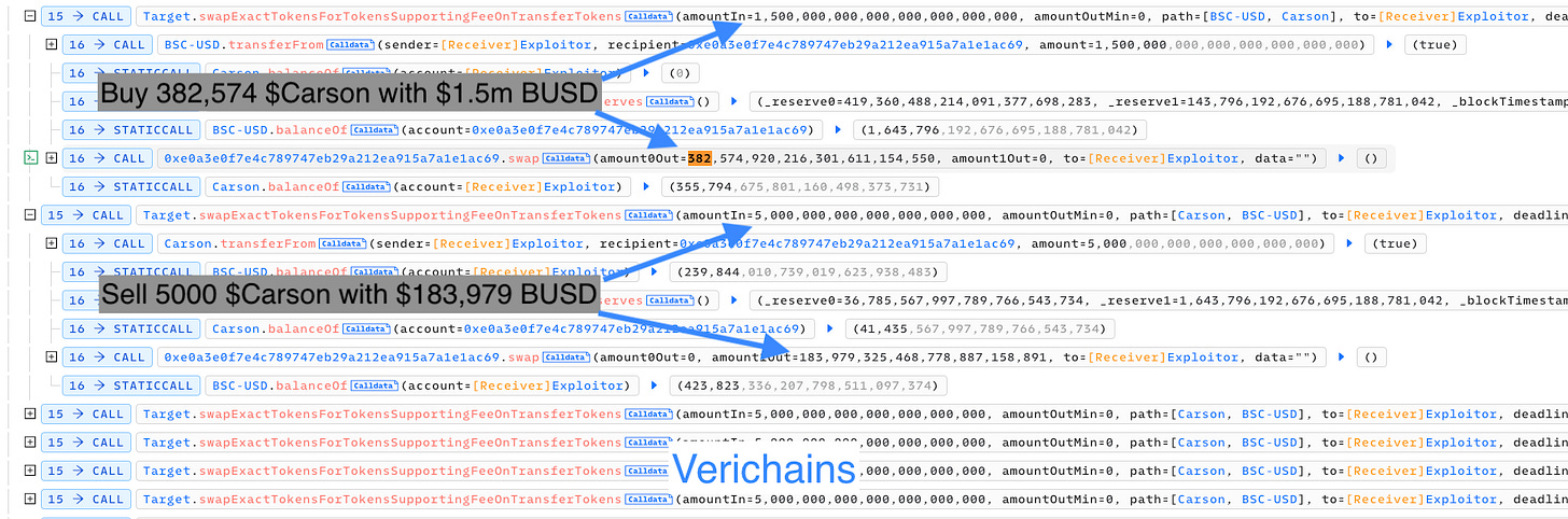 A token called $Carson suffered a flashloan attack, losing ~$14,400. The attacker took a flash loan of 1.5 million BUSD from multiple pools. With this borrowed amount, they purchased 382,574 tokens of $Carson. Afterward, the attacker engaged in a series of rapid token sales, divesting 5,000 tokens at a time until the entire borrowed fund was depleted. By carefully orchestrating the sales, the attacker ensured that each transaction yielded profits higher than the initial purchase price, allowing them to profit from the operation.