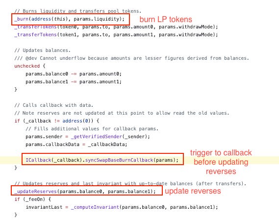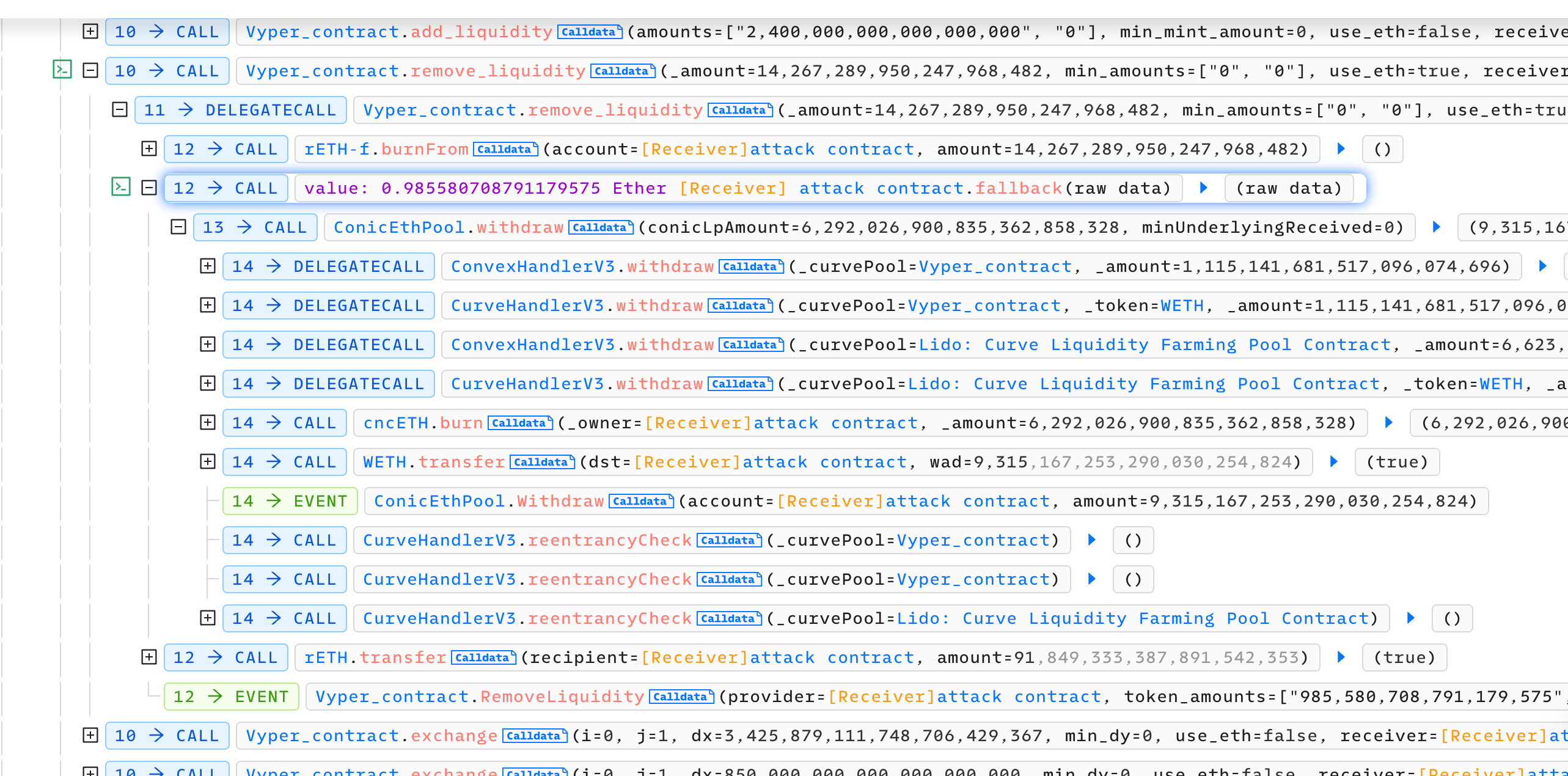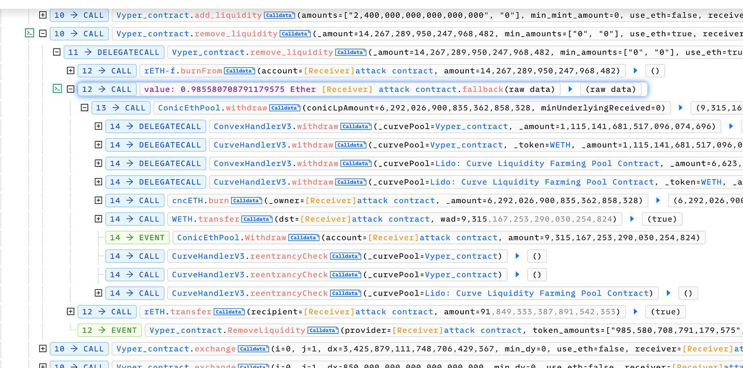 function on Curve pools, the attacker triggered ETH withdrawals and was able to perform reentrancy attacks. Although the ConicEthPool
