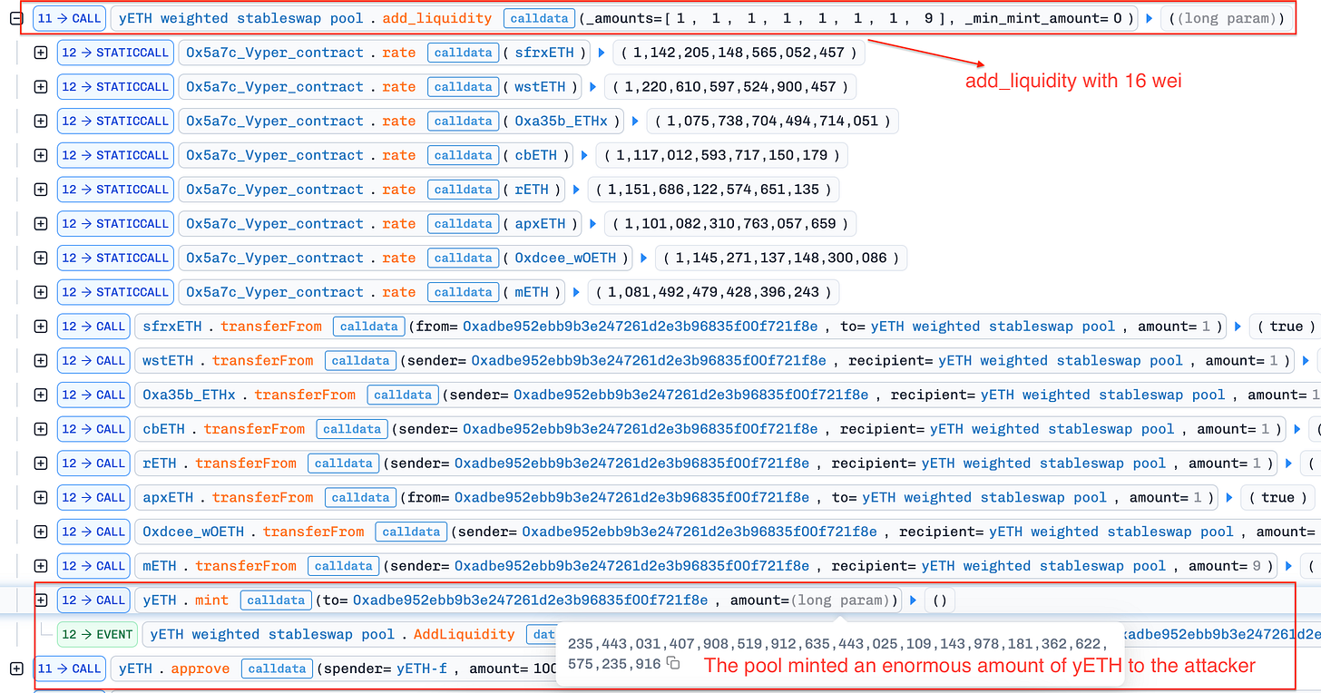 Phase 3—Infinite Mint: With the pool emptied (prev_supply = 0), the attacker re-entered the bootstrap initialization path and deposited a configuration violating A⋅Σ≥D⋅Π. The solver’s unsafe arithmetic underflowed, wrapping to the maximum uint256 value and producing approximately 2.35 × 10^56 yETH tokens.