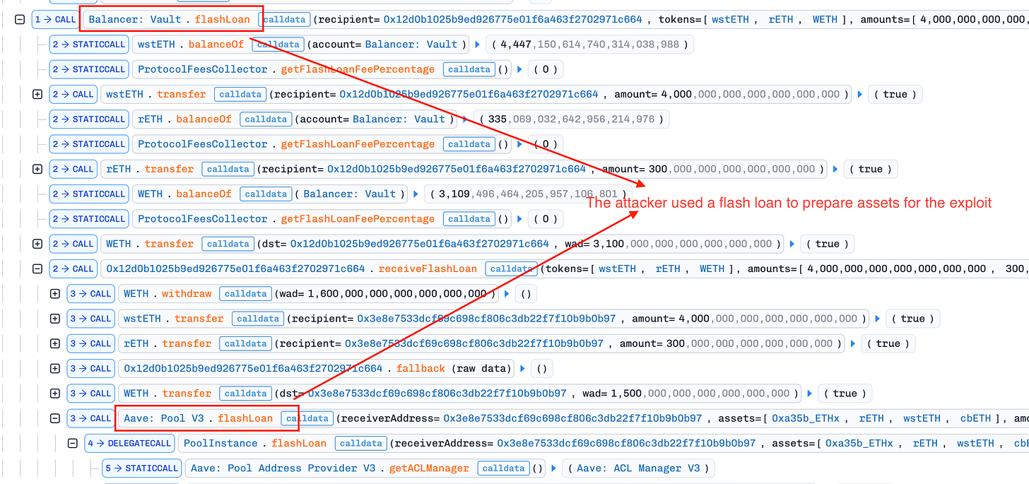 Flash Loan Liquidity: The attacker borrowed large amounts of liquid staking tokens (LSTs)—wstETH, rETH, and cbETH—from the yETH pool via flash loan.